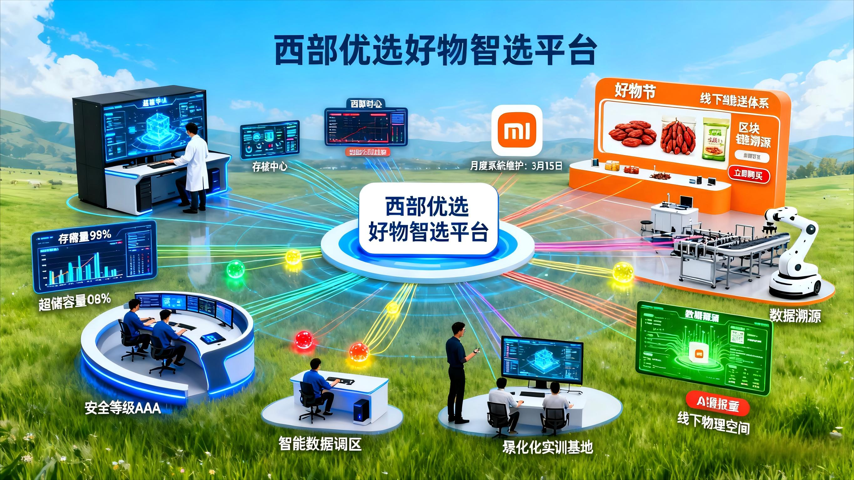 智能超算中心重点划分五大功能区域,构建全链条算力服务体系:承载核心计算能力,为产业升级提供算力支撑的超算核心区;负责数据安全存储,保障产业数据资产稳定的存储区域;实现数据高效流转与智能分配,提升数据利用效率的智能数据调度区;统筹中心日常运营与维护,确保系统稳定运行的运维管理区和结合实际应用场景,开展专业技能实训,培育产业人才的场景化实训基地。西部优选好物智选平台打造以线上+线下一体化服务体系,打通地方特色产品全链条服务。线上平台通过西部时报“AI报童”“IP”品牌搭建智能推送系统,以供应链、区块链为核心技术完成地方特色产品的展览展示及交易服务等业务,线下建设西部好物优选智能平台落地物理空间,完成地方特色产品的包装加工、仓储、分装、分发销售、签发服务、数据溯源等以及举办创新性消费场景好物节等。